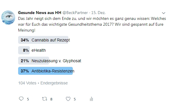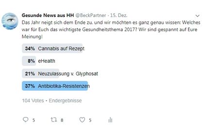 Es begann mit einer gesetzlichen Neuregelung, die den Zugang zu Cannabis als Medikament erleichterte und endete mit einer erneuten Debatte über eine Bürgerversicherung: An Gesundheitsthemen hat es 2017 wahrlich nicht gemangelt. Je nach persönlicher Betroffenheit variierte ganz bestimmt die Wahrnehmung der jeweiligen Relevanz. Aber welches Thema hat die Deutschen in Summe am meisten beschäftigt? Wir wollten es genauer wissen und haben einfach mal bei Twitter nachgefragt. 104 zwitscherfreudige User haben mitgemacht und damit ein nicht repräsentatives, aber doch aussagekräftiges Bild gezeichnet. Das Ergebnis: Die meisten Stimmen fielen auf die Problematik rund um die Zunahme der Antibiotika-Resistenzen und machten diese beunruhigende Entwicklung damit zum Top-Thema 2017!